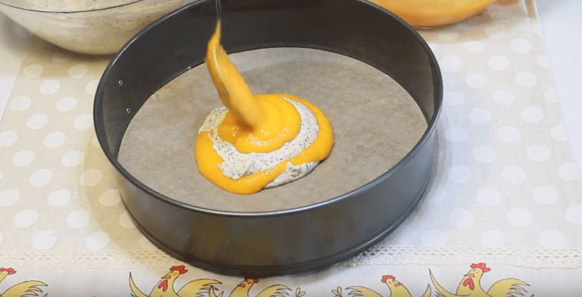 - Силиконовую форму смазываем растительным маслом. Выкладываем в нее поочередно по 2–3 ст. л. каждого теста, одно поверх другого. Форму можно периодически встряхивать, чтобы тесто равномерно распределилось.