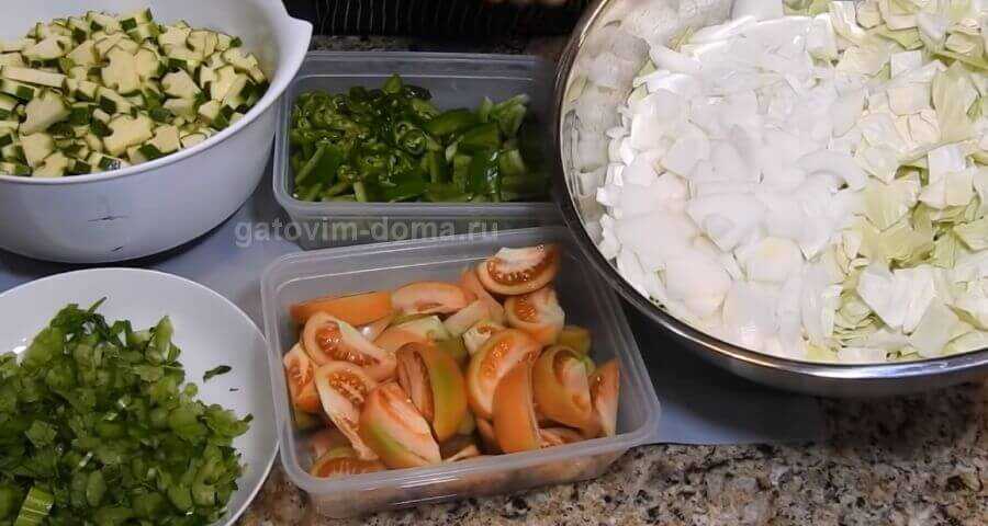Сперва нужно произвольно нарезать все овощи. Затем все эти нарезки выкладываем в одну большую емкость.