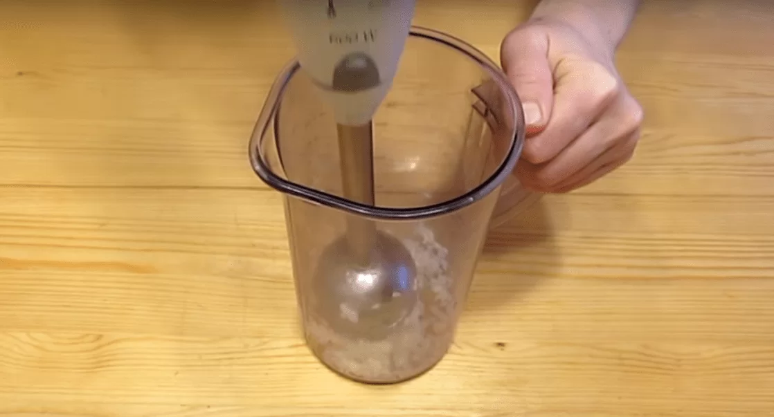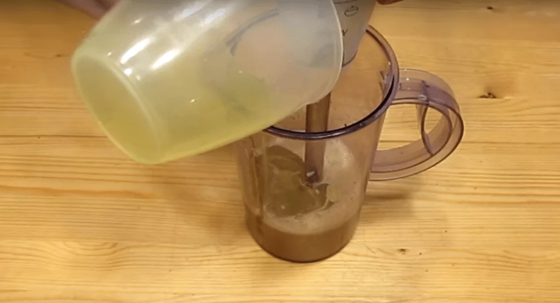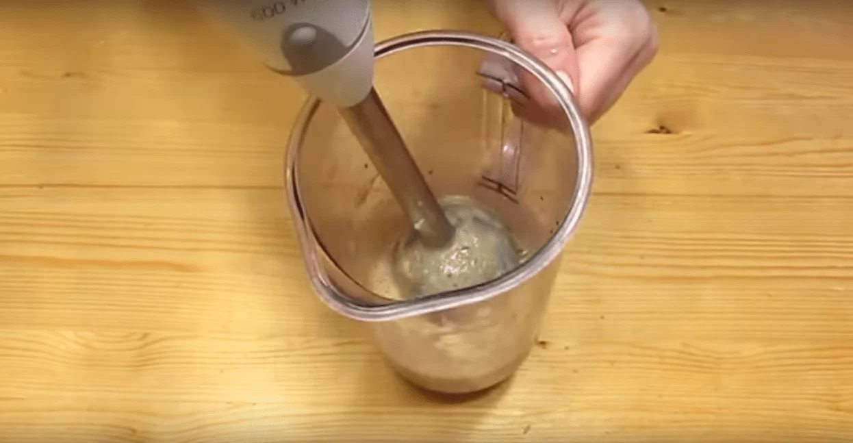 После смешивания ставим блендер на дно стакана, а сверху вливаем оливковое масло. Не поднимая блендер, начинаем включать его пульсирующими движениями, чтобы масло равномерно смешалось с соусом.