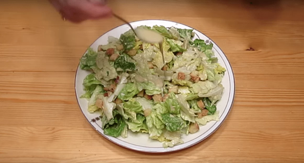 Выкладываем салат на тарелку, насыпаем сверху еще горсть сухариков и кладем 3-4 столовые ложки соуса, разливая его по всей площади салата.