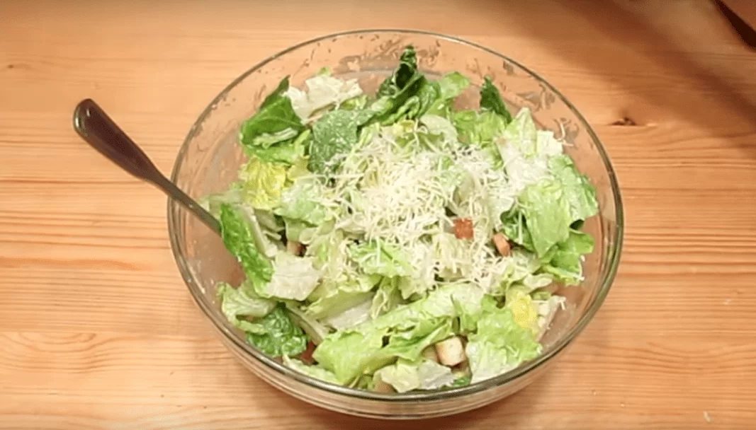 - Зелень для цезаря можно использовать самую разнообразную. Листья салата, рукколу, базилик, пекинскую капусту. В слоеном цезаре лучше всего делать несколько слоев из зелени. Например, один слой — листы салата, другой — руккола или базилик.