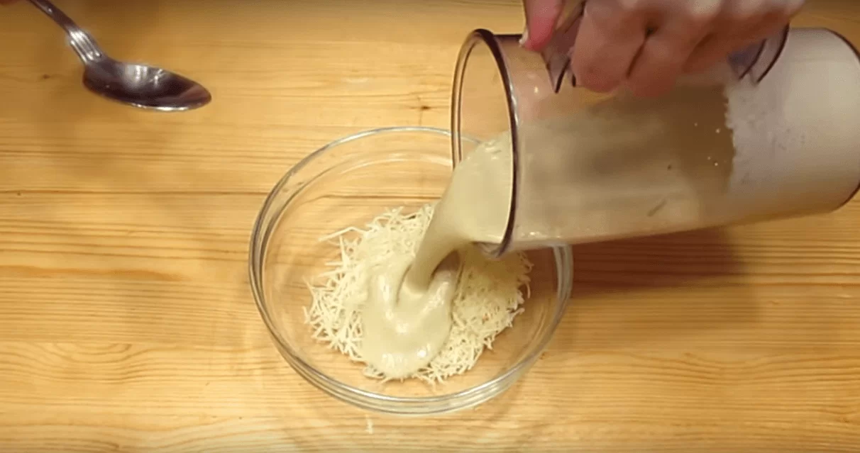 Выливаем смесь в глубокую тарелку с тертым пармезаном, перемешиваем ложкой и соус для Цезаря готов.