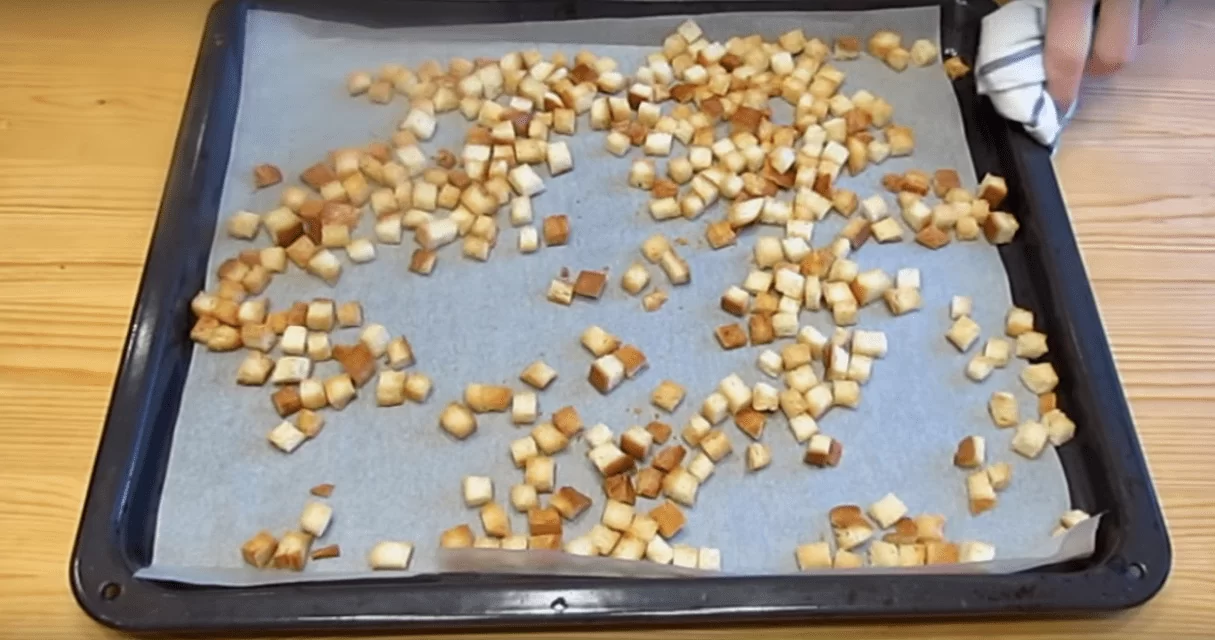 - Сухарики лучше всего готовить самостоятельно. Можно приправить их чесноком или ароматными травами. Главное — не передержать гренки в духовке, чтобы они не горчили в салате. Достаточно подсушить их или поджарить до еле румяного состояния.