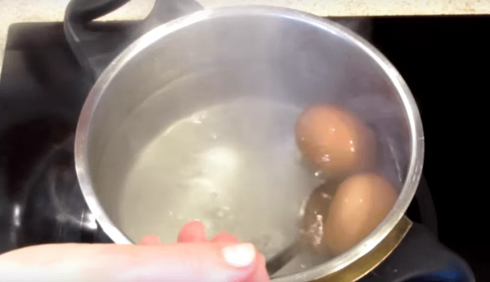 Кладем яйца в кипящую подсоленную воду ровно на одну минуту. Затем опускаем их в холодную воду и даем остыть.