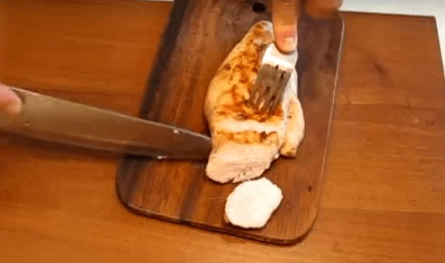 Куриную грудку немного солим и обжариваем на сковороде с оливковым маслом по 7 минут с каждой стороны. Даем ей остыть при комнатной температуре и нарезаем тонкими ломтиками.