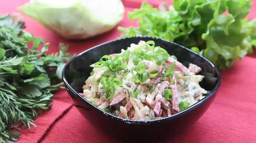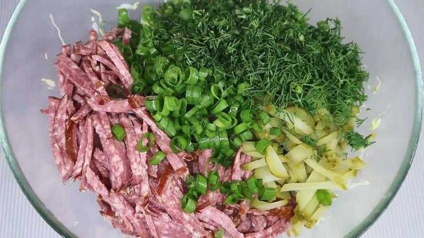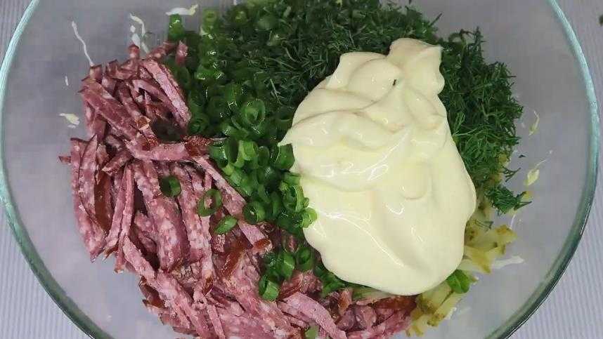 Салат из свежей капусты с майонезом и колбасой