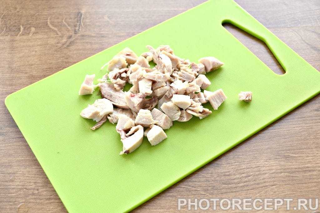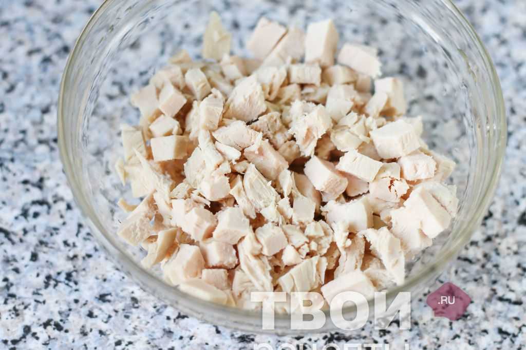 Отварите до готовности куриную грудку. После того, как она остынет, нарежьте ее на небольшие кусочки.