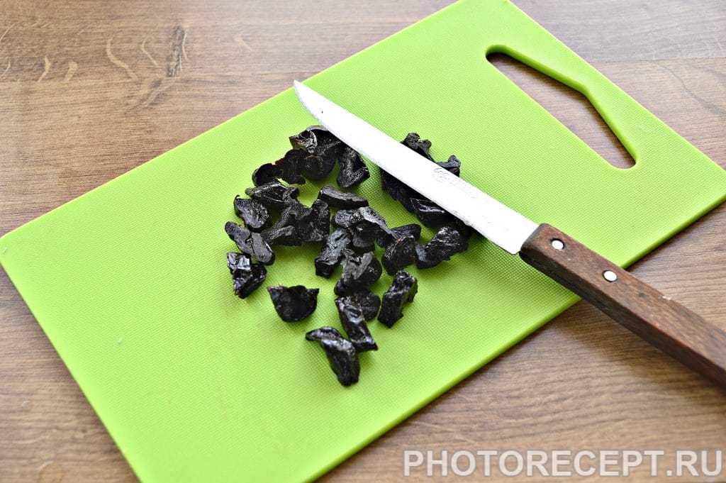 Чернослив (его предварительно нужно залить кипятком, а потом обсушить на тканом полотенце) нарезаем полосками. Перекладываем измельченный чернослив к ингредиентам в миску.