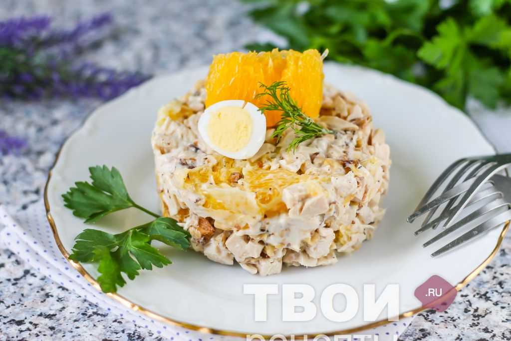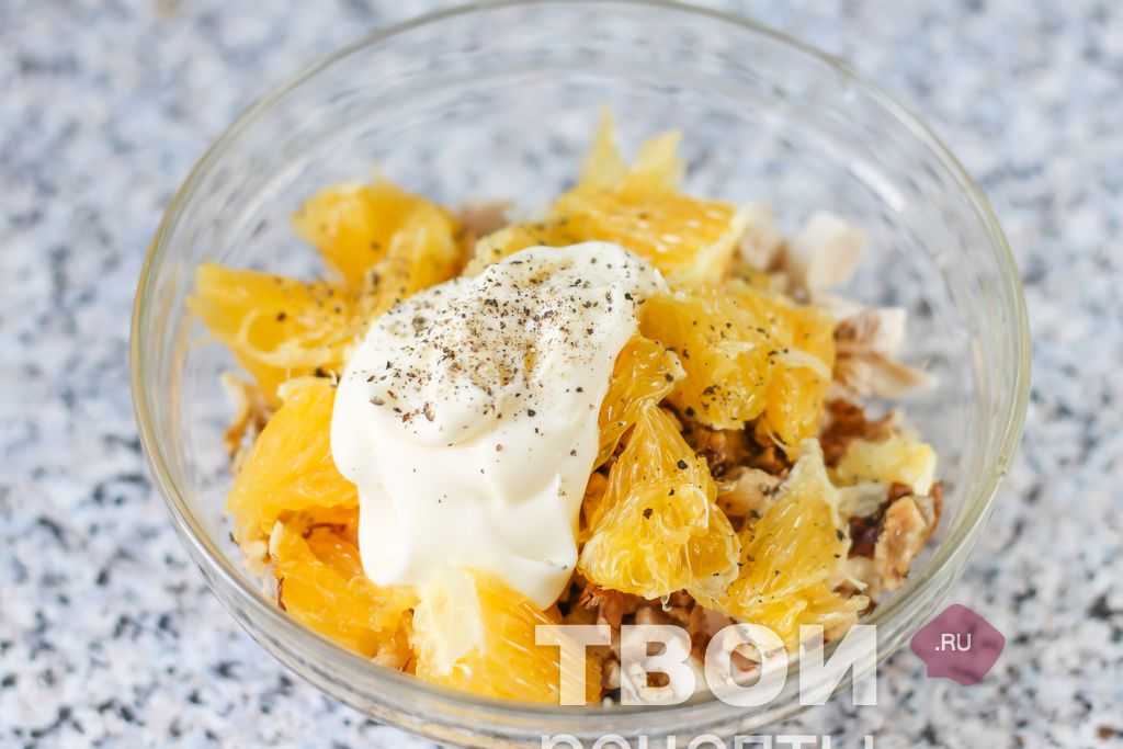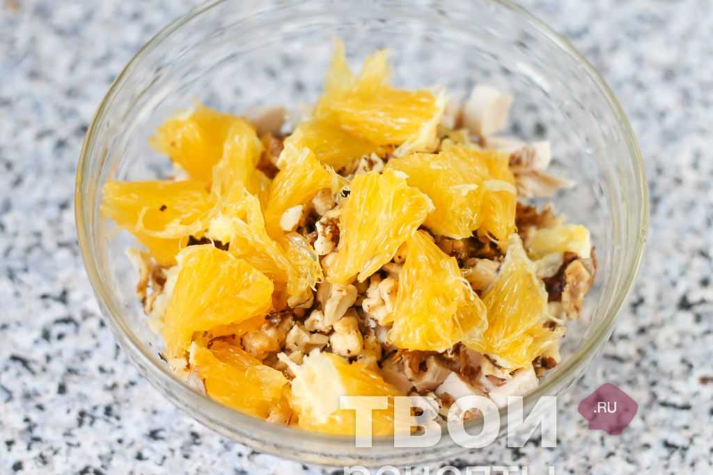 Рецепт 6, пошаговый: салат с курицей, апельсином, орехами