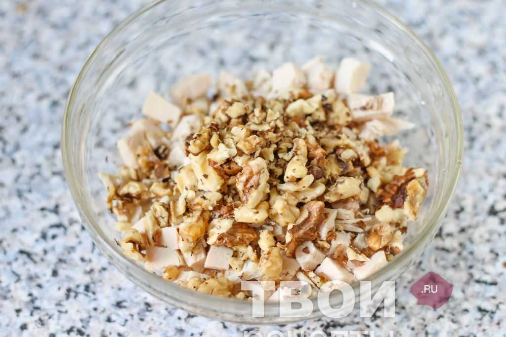 Салат приобретет удивительный вкус благодаря грецким орехам. Количество орехов, которое нужно добавить в блюдо, определяется исходя из собственных предпочтений.
