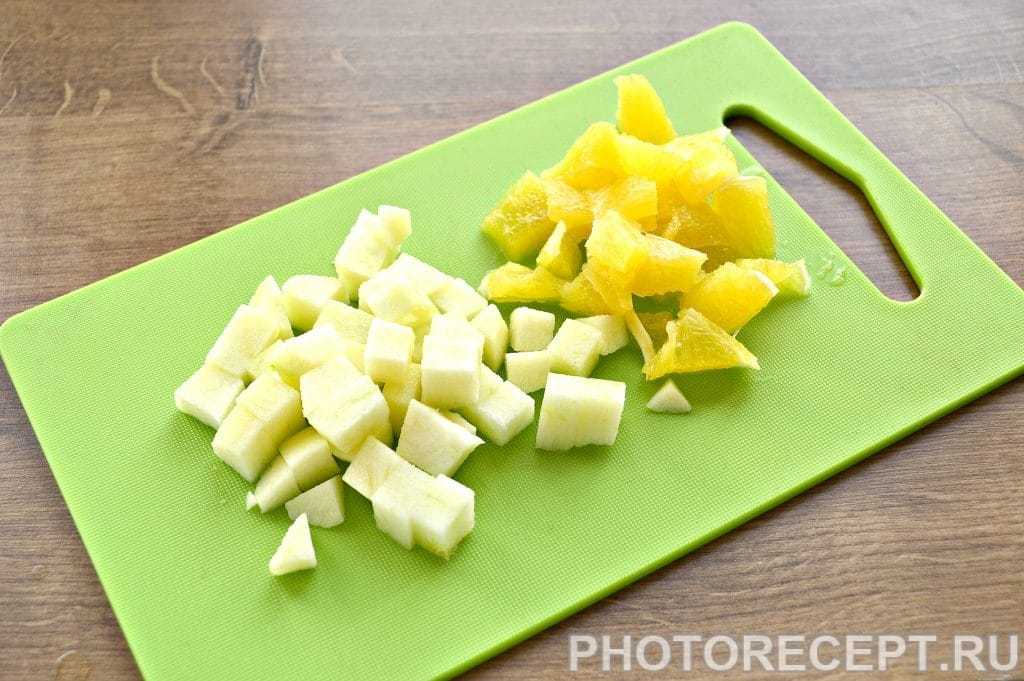 Начинаем измельчение фруктов – яблока и апельсина. С яблока нужно срезать кожуру, нарезать в форме кубиков. Добавляем яблочные кубики в миску. С апельсина также срезаем кожурку, захватывая белую часть. Удаляем перегородки и семена. Нарезаем очищенный апельсин кубиками.