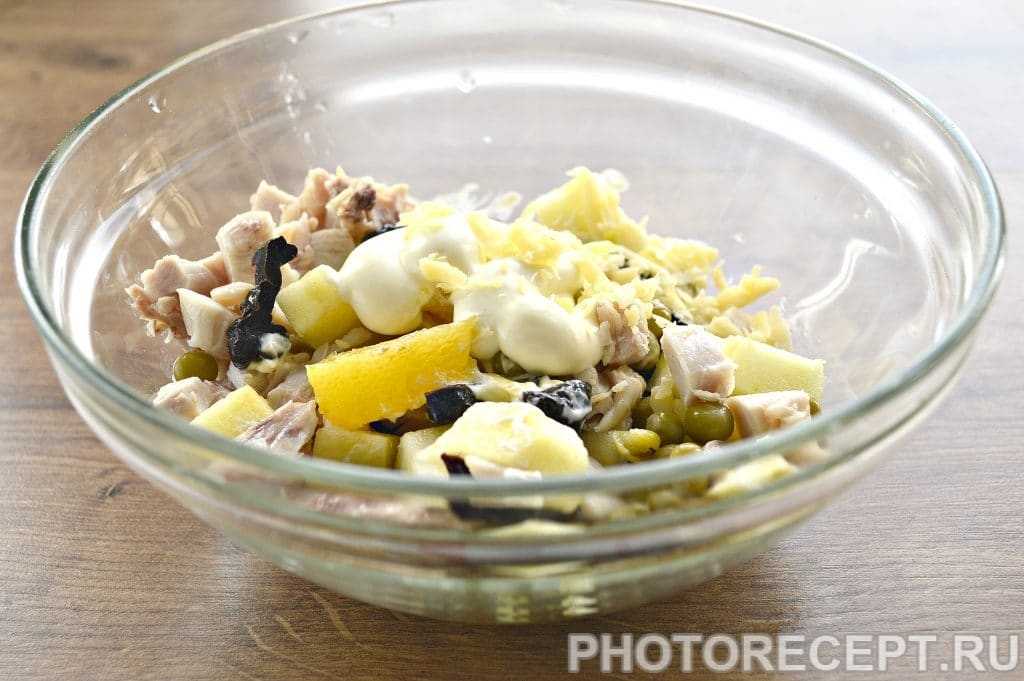 К ингредиентам в миску добавляем немного консервированного зеленого горошка или кукурузы. Заправляем салат майонезом и начинаем перемешивать.