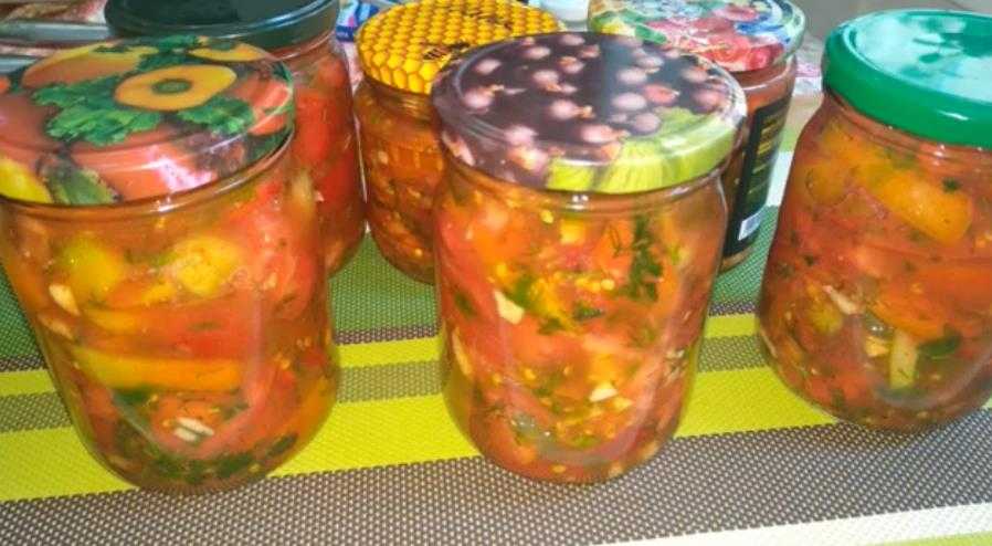 Аппетитной заготовкой на зиму станет салат, в который кроме сочных помидоров добавляется сладкий болгарский перец. В нем четко ощущается аромат чеснока, который дополняется большим количеством разнообразной зелени. Этот салат напоминает традиционное лечо, он получается освежающим и вкусным.