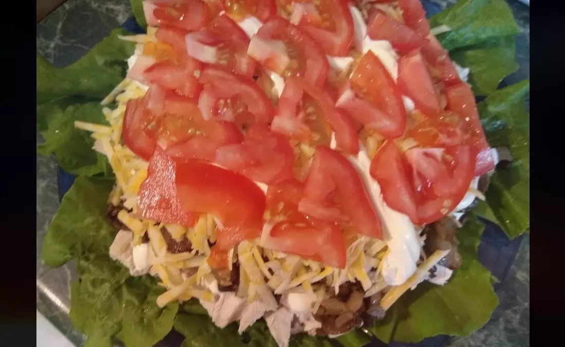 - Помидоры режем кружками и выкладываем на поверхность салата.