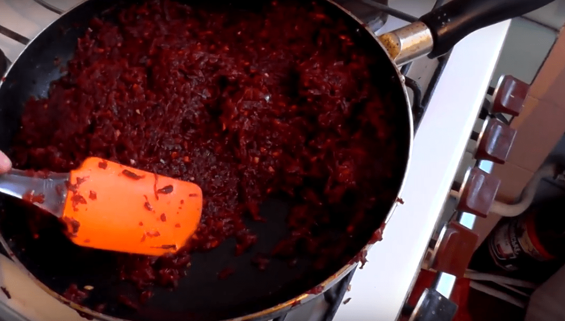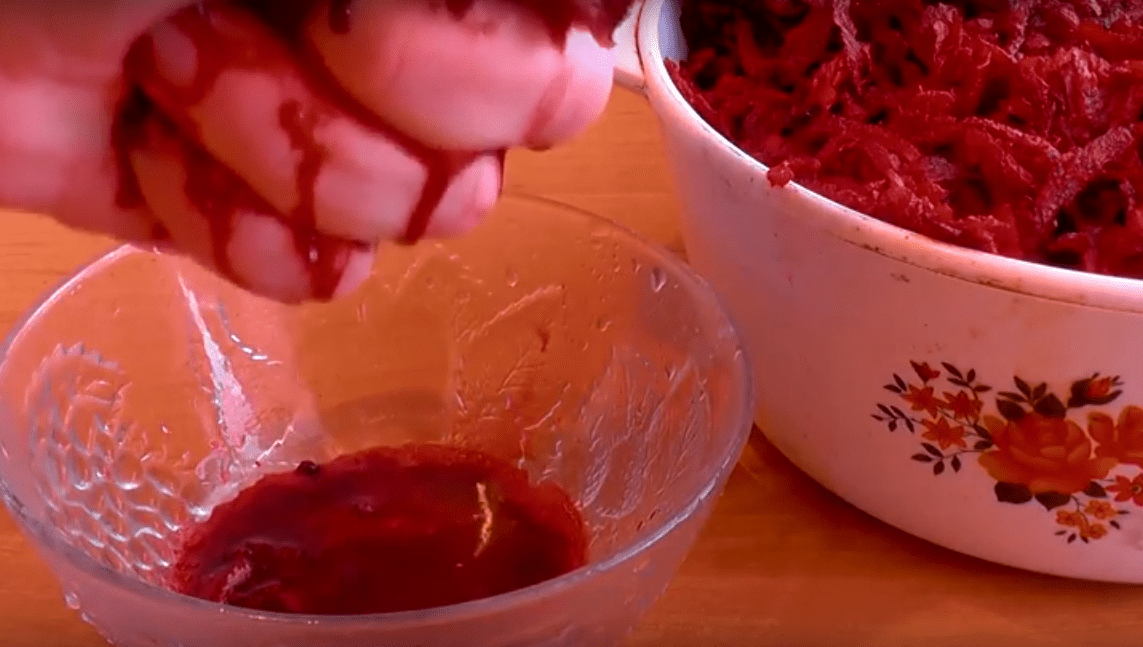 Берем горсточку в руку и сильно сдавливаем. И так, постепенно, отжимаем всю натертую свеклу.