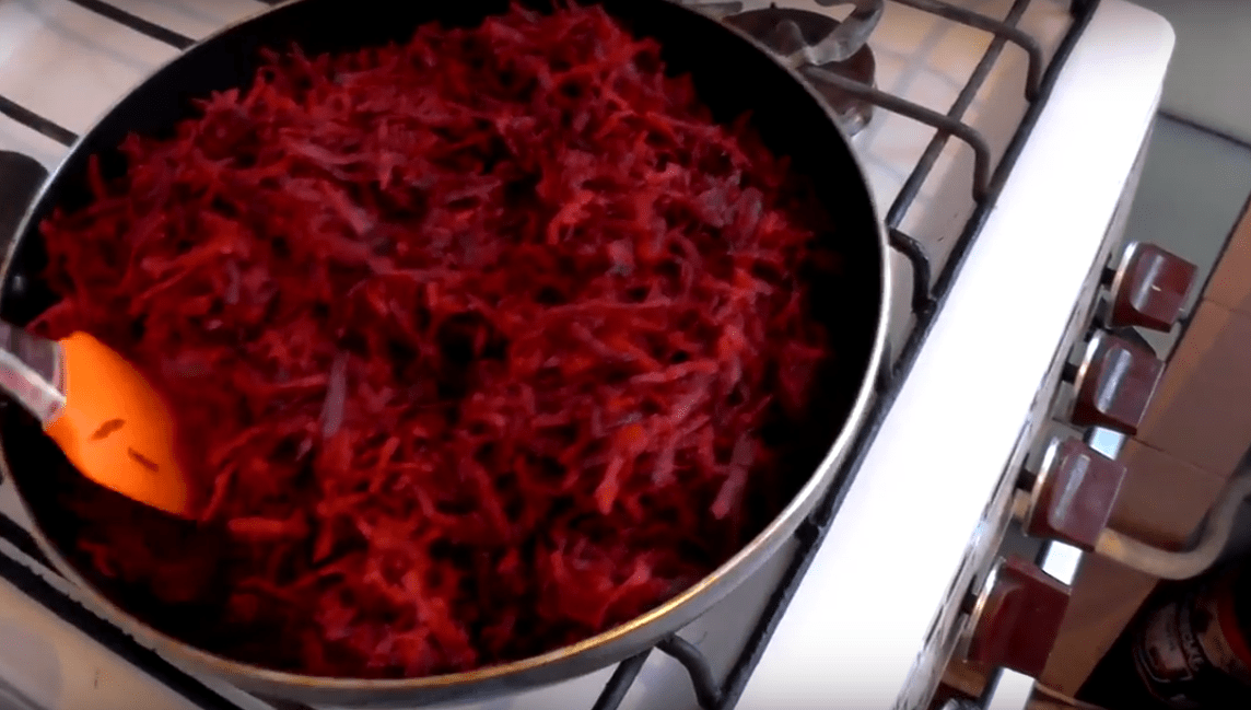 Затем выкладываем свеклу на разогретую сковороду с небольшим количеством подсолнечного масла, прожариваем ее 3-5 минут постоянно помешивая, а потом накрываем крышкой и оставляем тушиться на среднем огне на 10 минут.