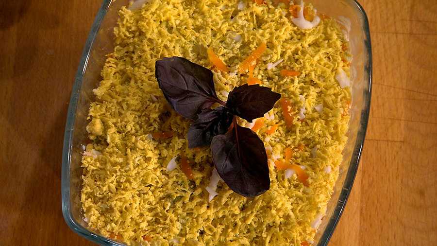 Сверху кладут измельченные отварные яйца, смешанные с йогуртом. Выше располагается чернослив, еще выше располагается тертый сыр. Украшает салат слой измельченной зелени. Салат сытный, но не сильно калорийный.