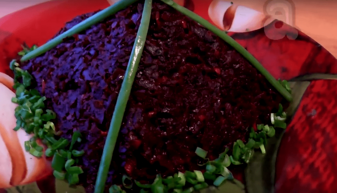 При подаче на стол «свекольного торта» можете декорировать верхушку салата зеленью или присыпать измельченными орешками.
