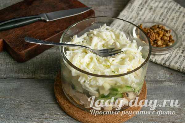 Слоеный салат со шпротами, маринованными огурцами и плавленым сыром