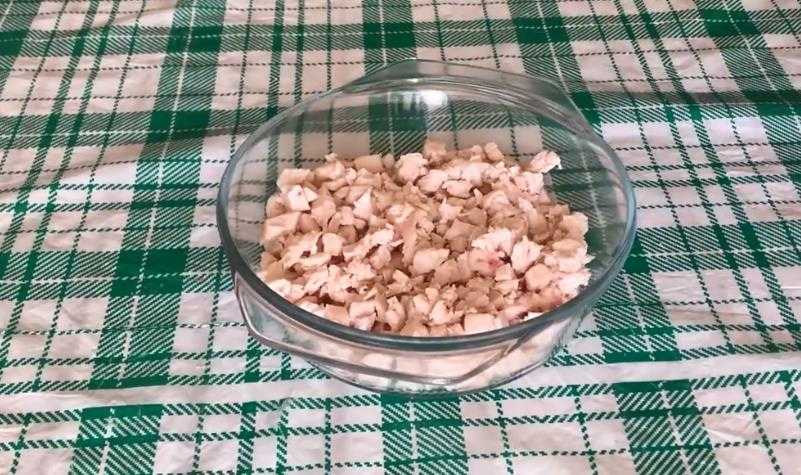 Курицу без костей и кожи нарубить кубиками, сделать из нее первый слой.