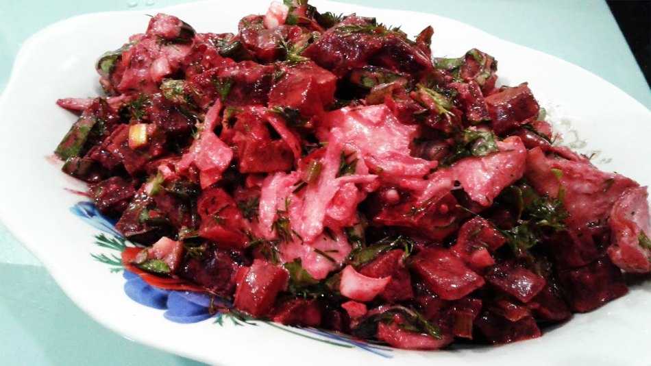 - Готовый салат перемешайте, нарубите в него зелень. И сразу подавайте салат к столу.