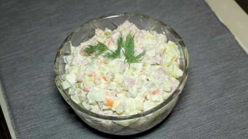 Вкусный и простой салат Оливье с ветчинной или сырокопченой колбасой, майонезом и горошком – правильный рецепт