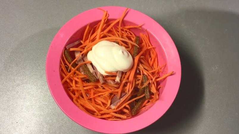 - В миске смешать фасоль, колбасу, сыр, свежие и соленые огурцы, морковь и яйца. Заправить майонезом и перемешать (солить необязательно).