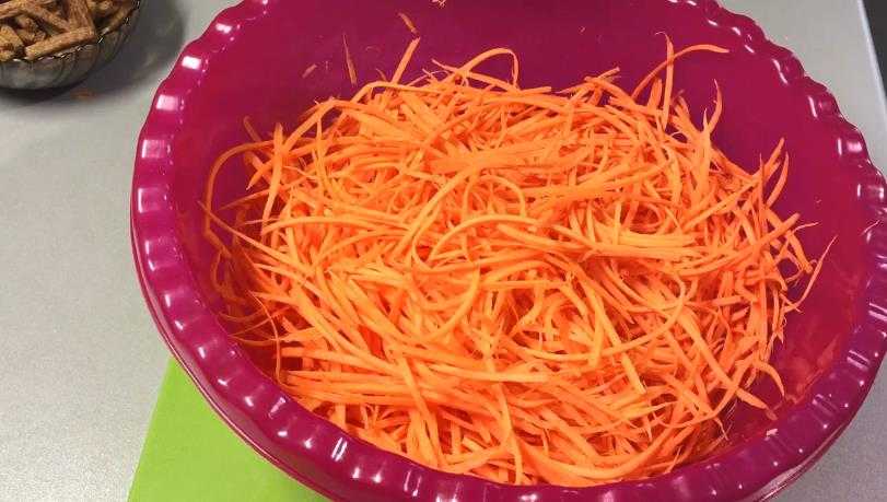 - Слить сок с моркови по-корейски и нарезать ее короткой соломкой.