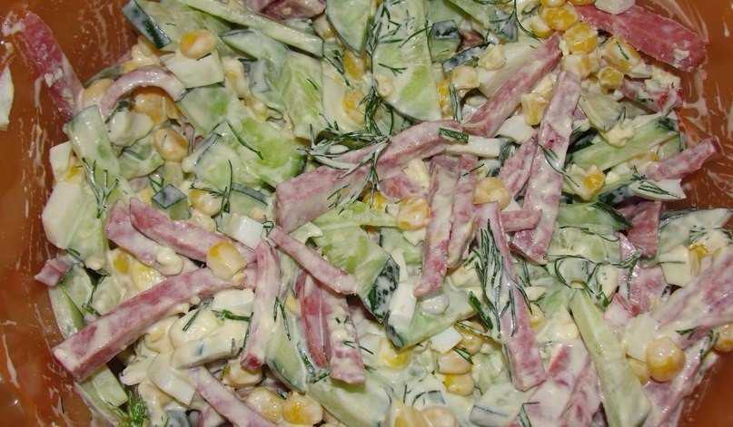 Салат с копченой колбасой со свежим огурцом, яйцом и кукурузой