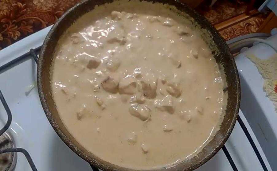 Посыпать обжаренную курятину солью, смесью перцев и залить сливками. Через 3 минуты смешать с фунчозой.