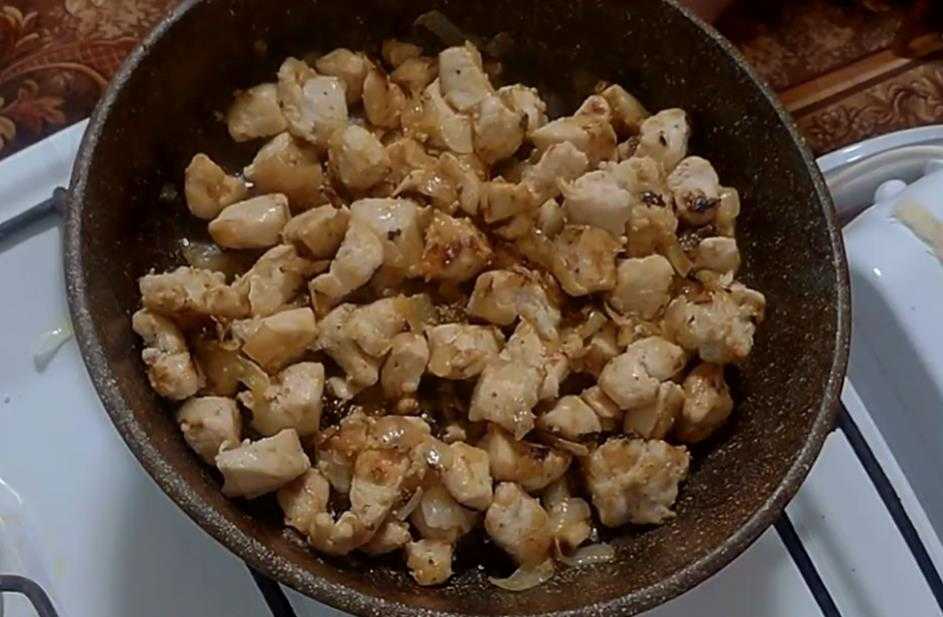 - Порежьте куриную грудку на небольшие кубики и, используя масло, обжарьте на сильном огне до появления золотистой корочки.