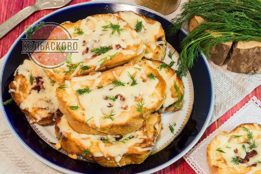 - Запекаем наши бутерброды в духовке при температуре 180 градусов около 10 минут. Перед подачей украшаем зеленью.