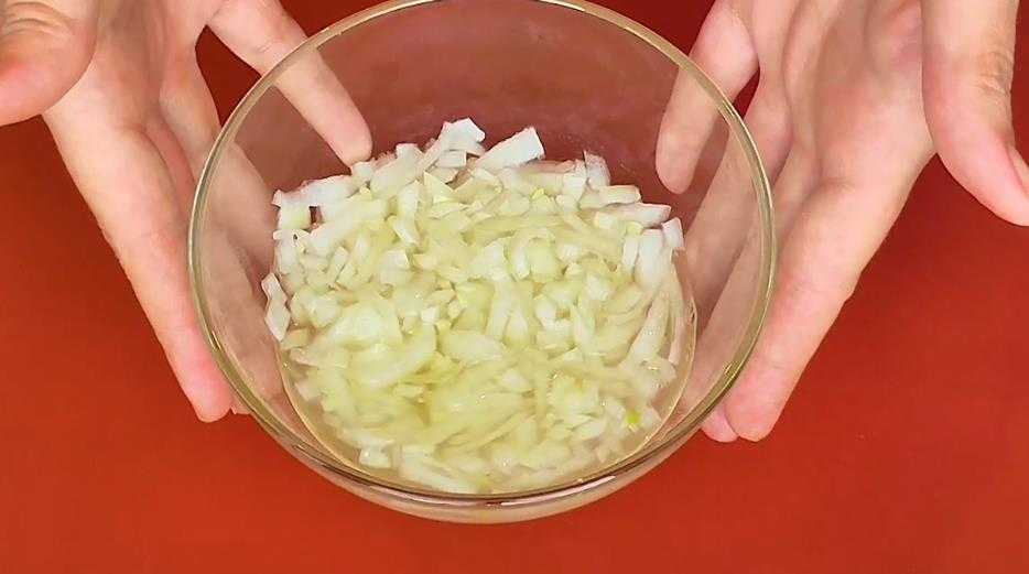 Нашинковать лук мелкими кубиками, посолить, добавить сахар и уксус. Залить кипяченой водой, промариновать в течение 15-20 минут.